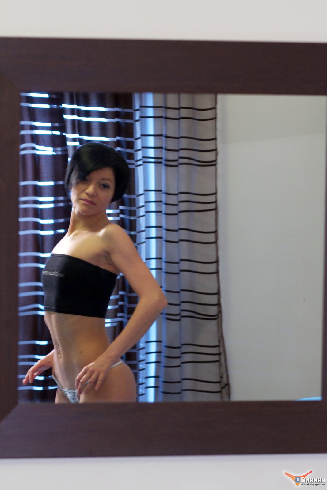 Фото брюнетки в стрингах (грудь прикрытая рукой) |