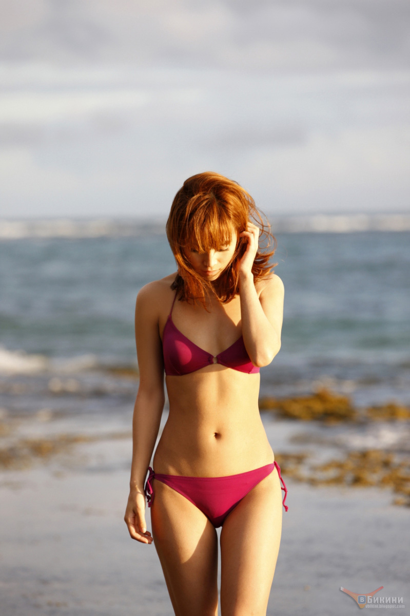 Фото японки Eri Kamei в сиреневом бикини на пляже |